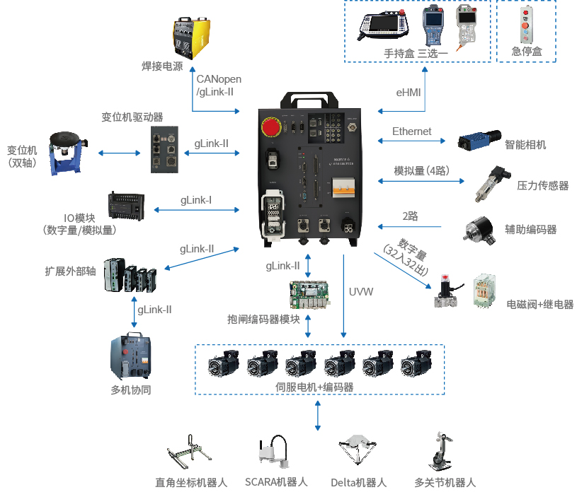 1.集运动控制器、机器人控制系统和六轴伺服驱动于一体